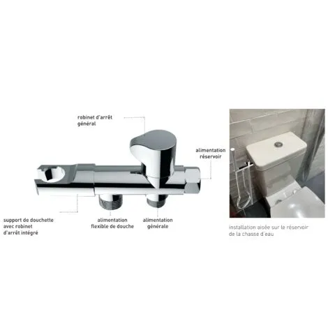Ce robinet 3 voies en laiton chromé permet d’installer une douchette hygiène WC. L’installation aisée sur le réservoir de la chasse d’eau.